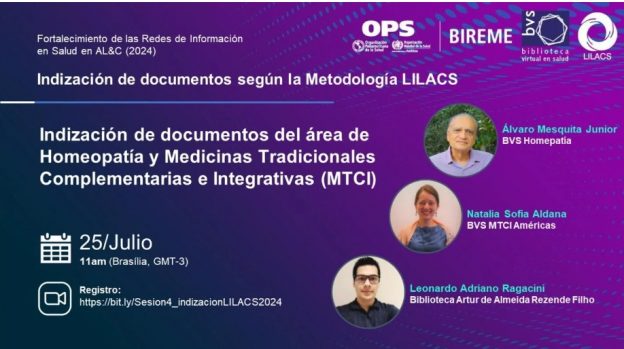 Únase a nosotros el jueves 25 de julio, de 11:00 a 12:00 (hora de Brasilia, GMT-3) en la cuarta sesión virtual sobre Indización de Documentos según la Metodología LILACS. En este seminario virtual, se presentarán las actualizaciones de las categorías “Homeopatía” y “Medicinas tradicionales, complementarias e integrativas (MTCI)”, abordándose los siguientes temas: