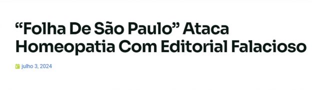 Reiterando sua postura editorial preconceituosa contra a Homeopatia, a “Folha de São Paulo” publicou Editorial falacioso criticando a especialidade médica (“Gasto nada homeopático”, 03/07/24), como o faz, de tempos em tempos, em diversas matérias sensacionalistas. Prova desse viés anti- homeopatia do jornal é que ele só publica artigos contrários à especialidade (estratégia pseudocética e pseudocientífica), embora receba, constantemente, diversos releases de estudos que “comprovam as evidências científicas da homeopatia” e que demonstram que “homeopatia não é efeito placebo”.